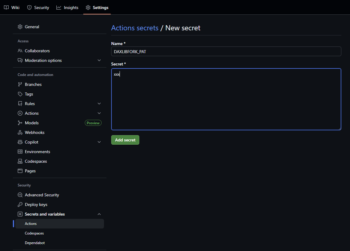 We add the token as a secret on evaluationcontext/evaluationcontext.colour, granting these permission to evaluationcontext/daxlib. So that the workflow run from evaluationcontext/evaluationcontext.colour can create a new branch in evaluationcontext/daxlib