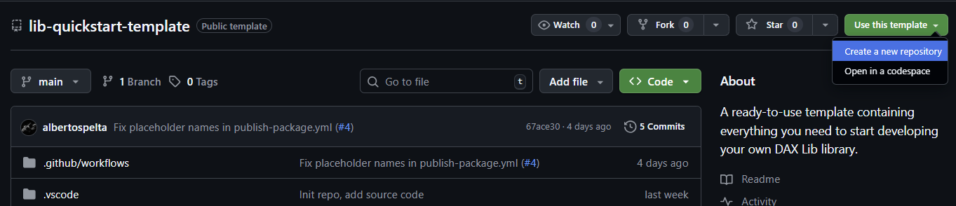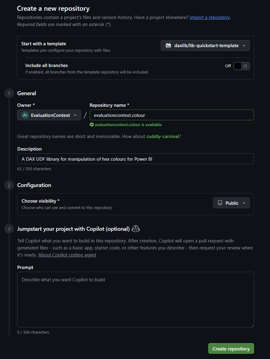 Let's start by creating a development repo ( evaluationcontext/evaluationcontext.colour) from daxlib/lib-quickstart-template. This is where we can develop our library.