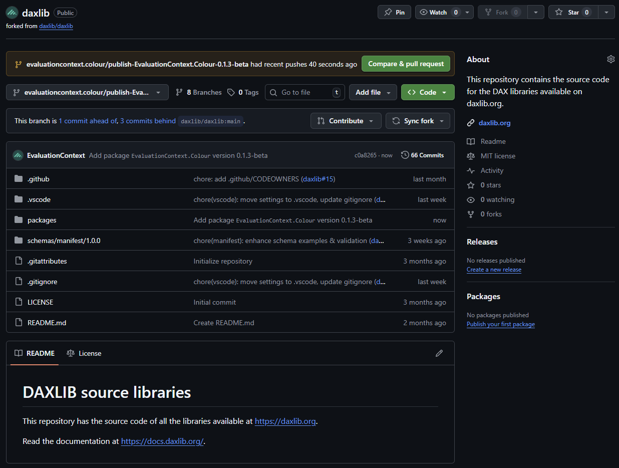 Once this has run we can navigate to our evaluationcontext/daxlib, and we confirm new branch ( evaluationcontext.colour/publish-EvaluationContext.Colour-0.1.3-beta) has been created.