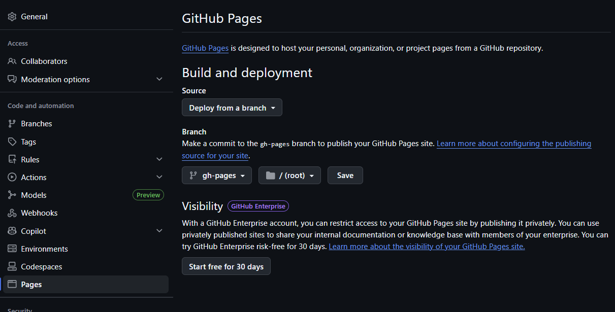 We can now setup GitHub pages to use the gh-pages branch as a source to deploy our site, by selecting Setting from the top nav bar of the Git Hub repo, select pages and set Deploy from a branch and set the branch to gh-pages, and select save.