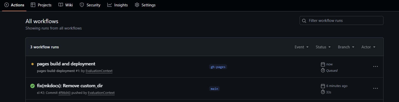 Then we can push to GitHub, this will run the ci job, which will execute mkdocs build, generating the html pages, and saving the result to a gh-pages branch.