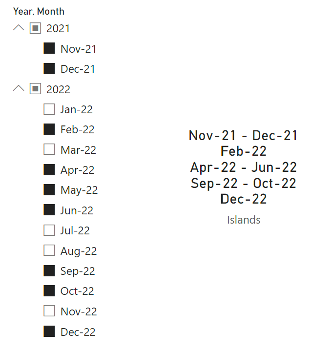 A while ago the SQLBI guys release a blog providing a solution for Displaying a list of selected months. The input is a selection of filter month, and the output list these months, with contiguous sequences grouped together. This was done by looking at leading and lagging values to detect edges of continuous sequences. This problem falls into the classic Island Problem, and there is another nice way to solve this.