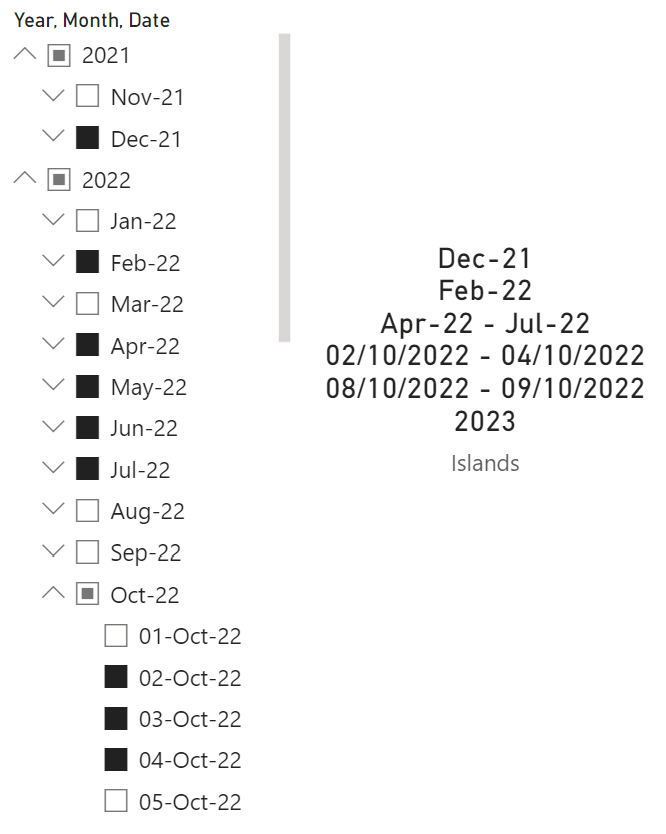This works well for a given granularity, but what about if we want to show a mixture of selected days, months and years. We can extend our solution as follows.