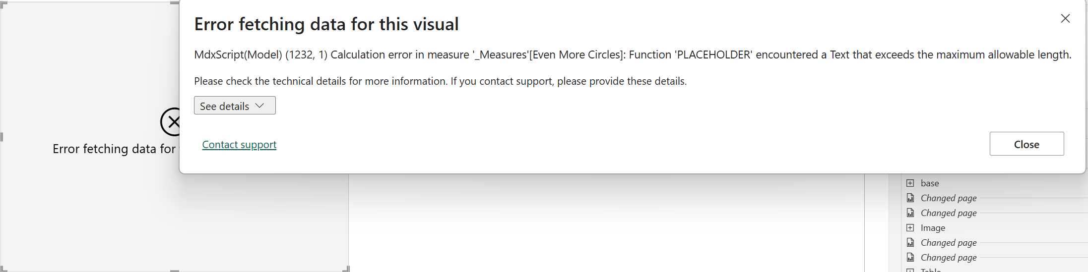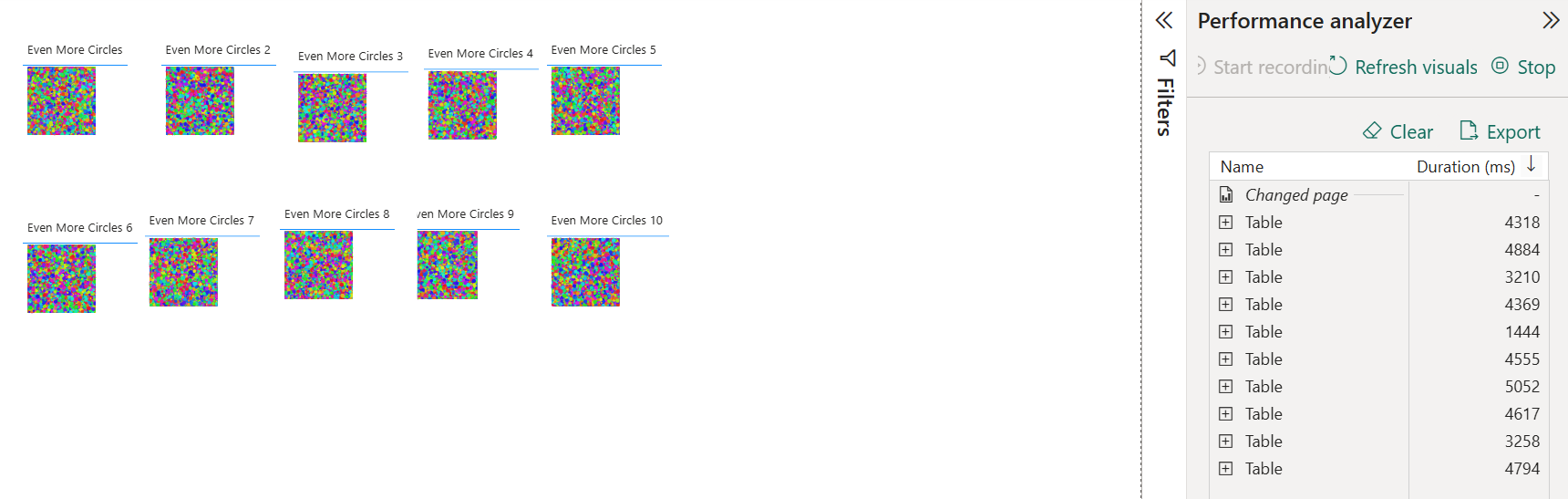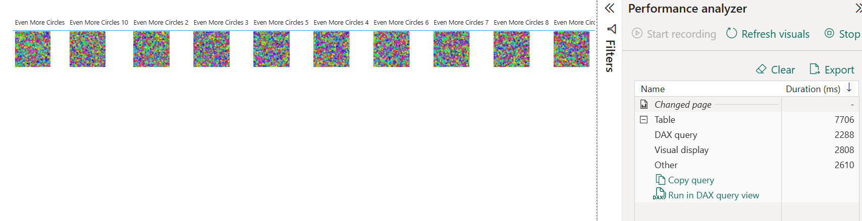 Just to see if I could really torture Power BI, I copied the [Even More Circles] measure into 10 separate measure (to avoid any caching) and added them to 10 separate tables on the same page.
