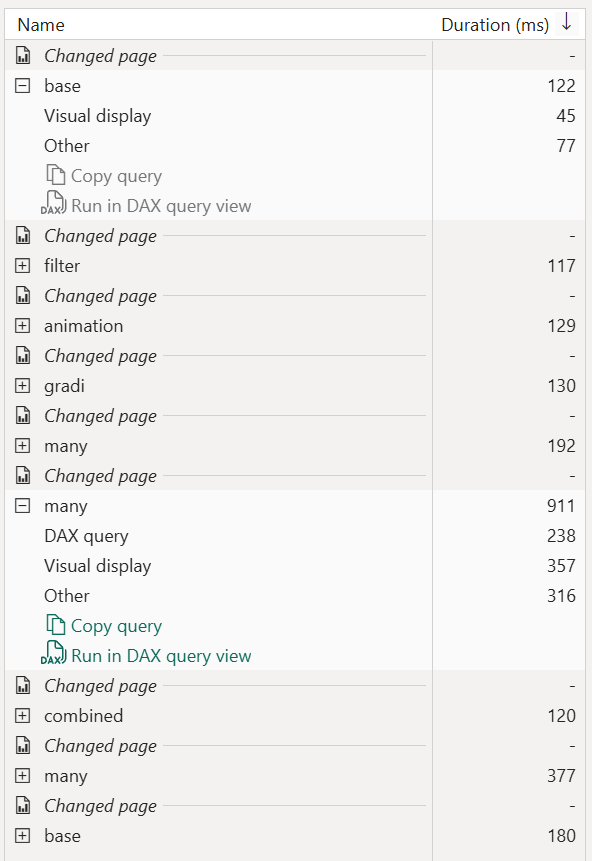 After recording all the pages we can look at the results. I did look at the json export but it didn't provide any extra insights. We can see all tests performed similarly except for [Even More Circles] which did have a some dax duration, but we also get a longer Visual Display and Other.