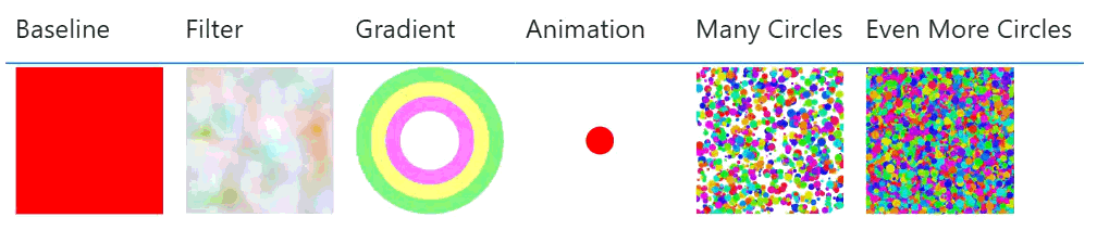 I consulted AI on which elements might be expensive to render, and it suggested animations <animate>, complex filters <filter>, and gradients <radialGradient>. This is related to any math the render engine will have to perform to output the visual. I also assumed that rending a large number of cheap elements might also be expensive. In addition I also added a simple humble <rect> as a baseline.