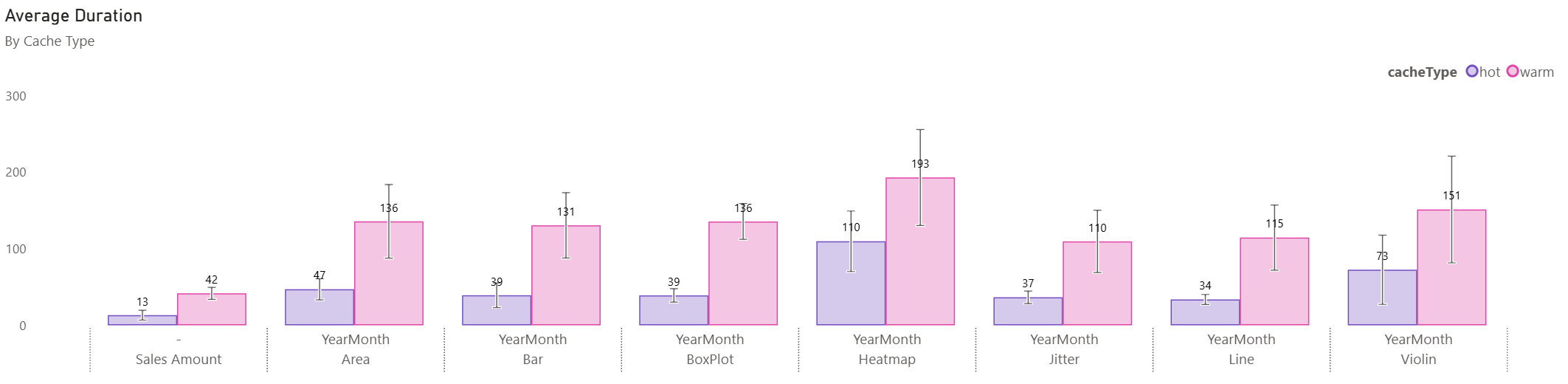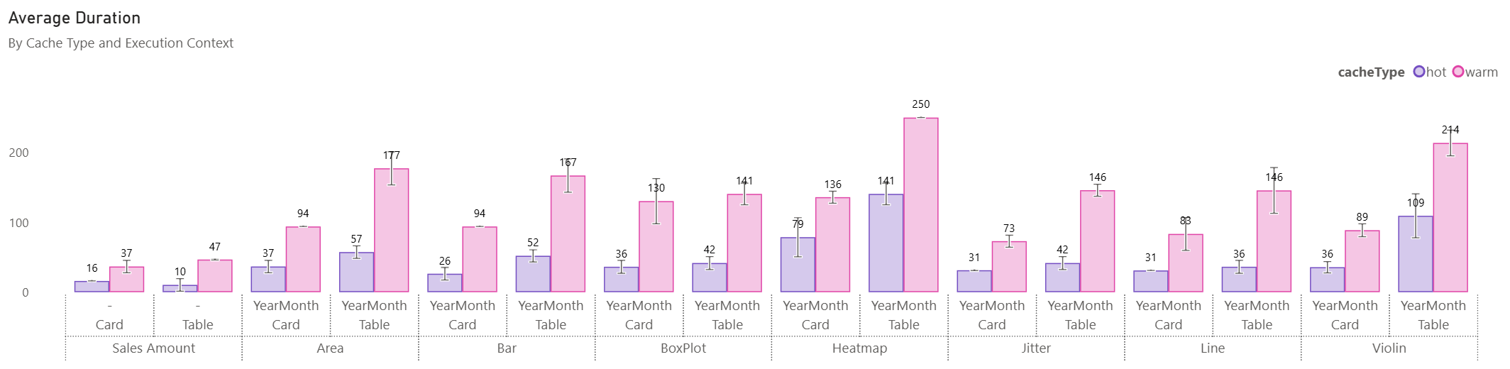 If we exclude the 'date'[Date] granularity measure, we can see the hot cache is at least 50% faster than the warm cache. Additionally the measures all return results in a range of 141-250ms in the table context, with daxlib.svg.compound.Heatmap and daxlib.svg.compound.Violin being the slowest.