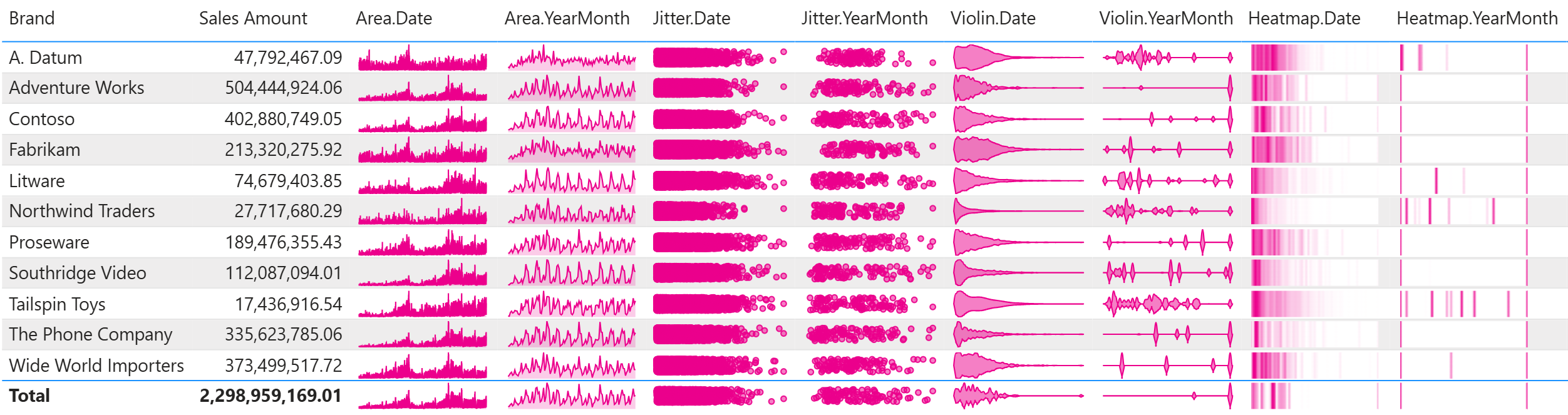The first query gets the SUM() of Sales per 'Date'[Year Month] and 'Product'[Brand], resulting in 1,890 rows, duration of 17ms and CPU of 16ms. This likely the generation of the initial cache to calculate the min and max data range to allow mapping from the data scale to the visual scale.