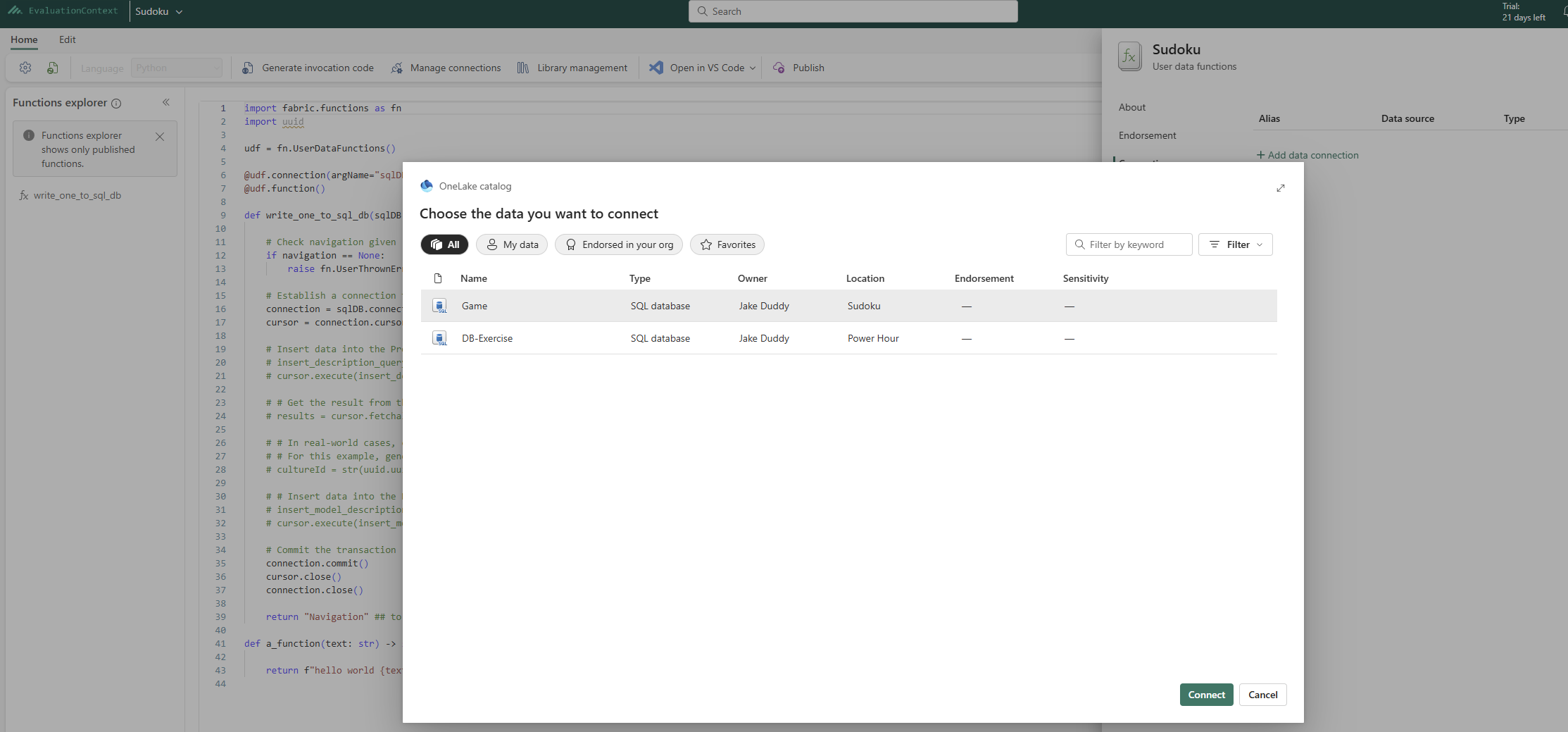At their core, they allow buttons within your Power BI reports to trigger Fabric User Data Functions (UDF). UDFs are python function that can perform an action, such as initiate changes in a Fabric SQL database. Within the button definition you map a button, list, or text slicer; a data field; or measures from the report to the input parameters of the UDF.