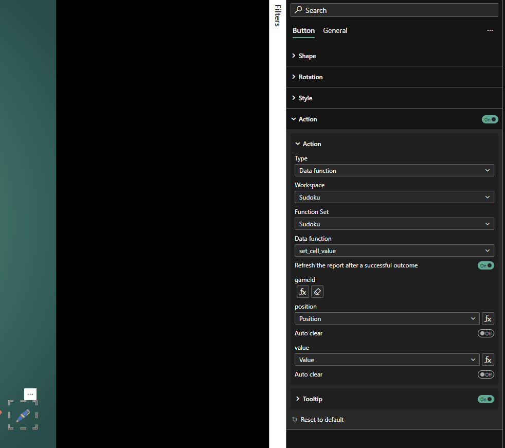 Finally, we'll add four buttons, each linked to one of our UDFs. We'll also need a couple of additional DAX measures to pass the current user's name and selected game ID: