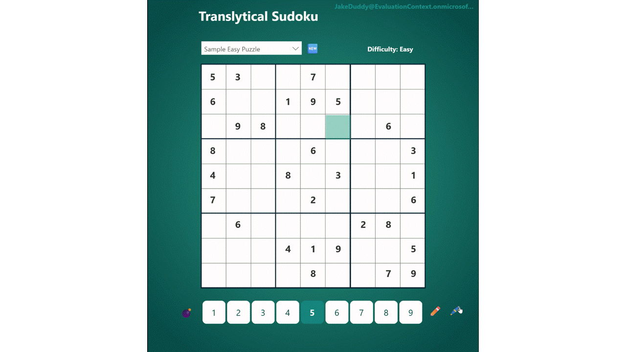 Our approach leverages a Fabric SQL database to store the game's initial state and, crucially, the player's progress. Players will interact with the Power BI report by selecting a cell on the grid and a candidate value. Pressing a button will then activate a UDF, which in turn updates the database.